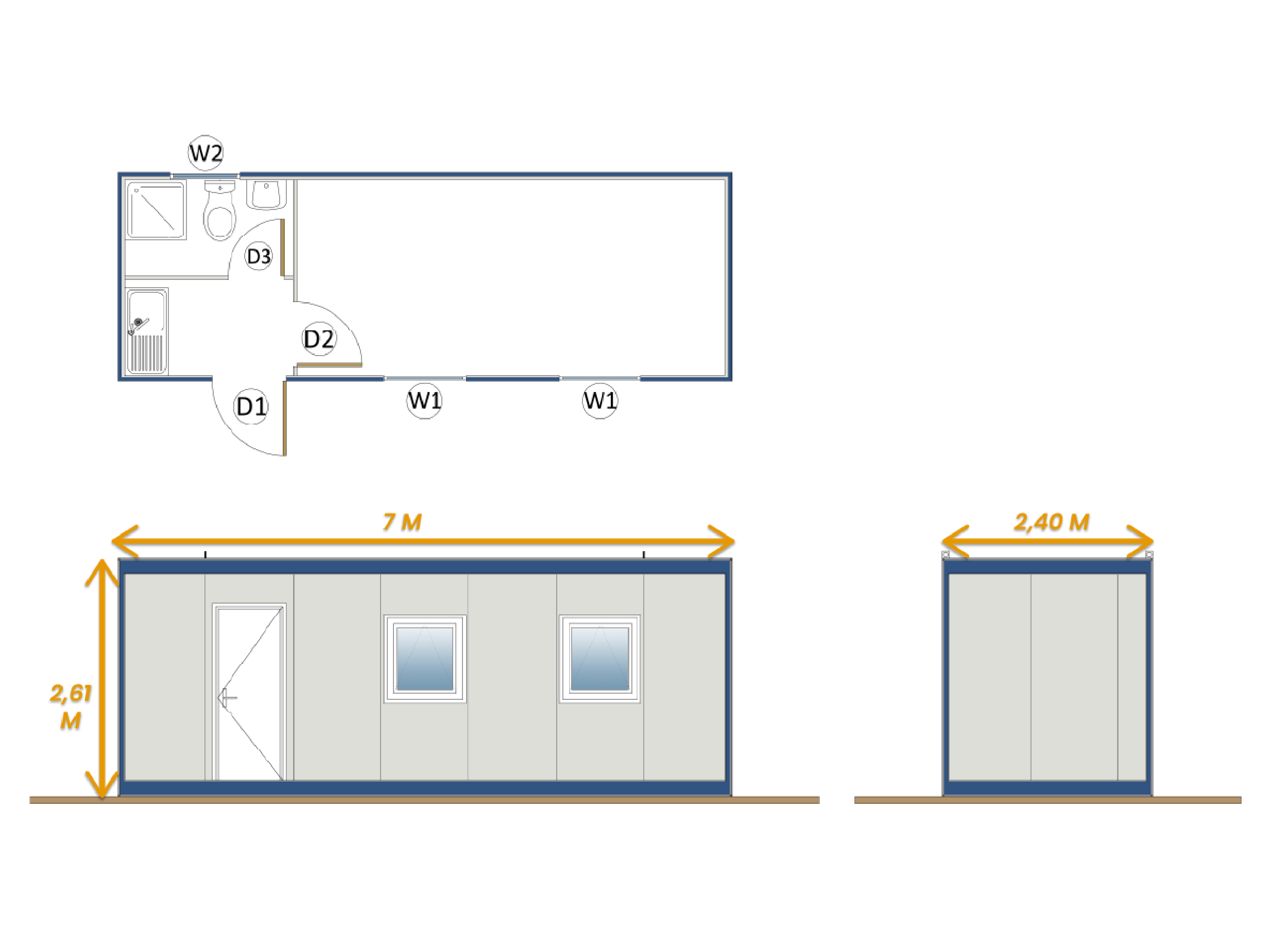 • Isolated and Spacious Main Office: The main working room entered through door D2 is highly spacious thanks to the advantage of the container’s 7 meter length. The two large front windows (W1) fill the room with natural light from every angle, creating a bright and productive working environment.