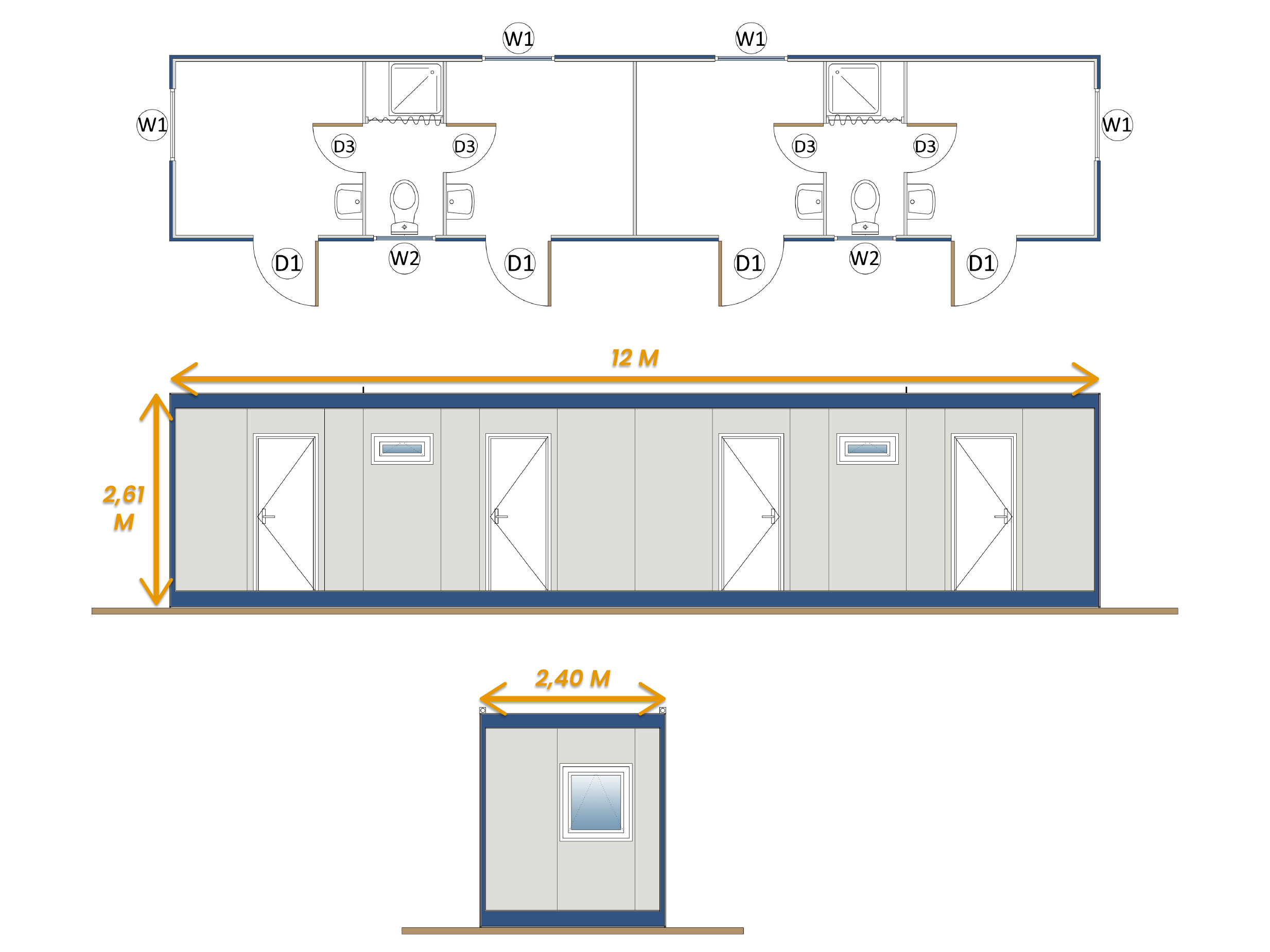 2 Shared Suite Style Bathroom Units: There are two central bathroom areas inside the container. Each bathroom unit is connected by interior doors (D3) to the two rooms on its right and left. Inside each bathroom, there is a shower tray, a toilet, and two separate washbasins according to the plan details, helping to minimize morning congestion.