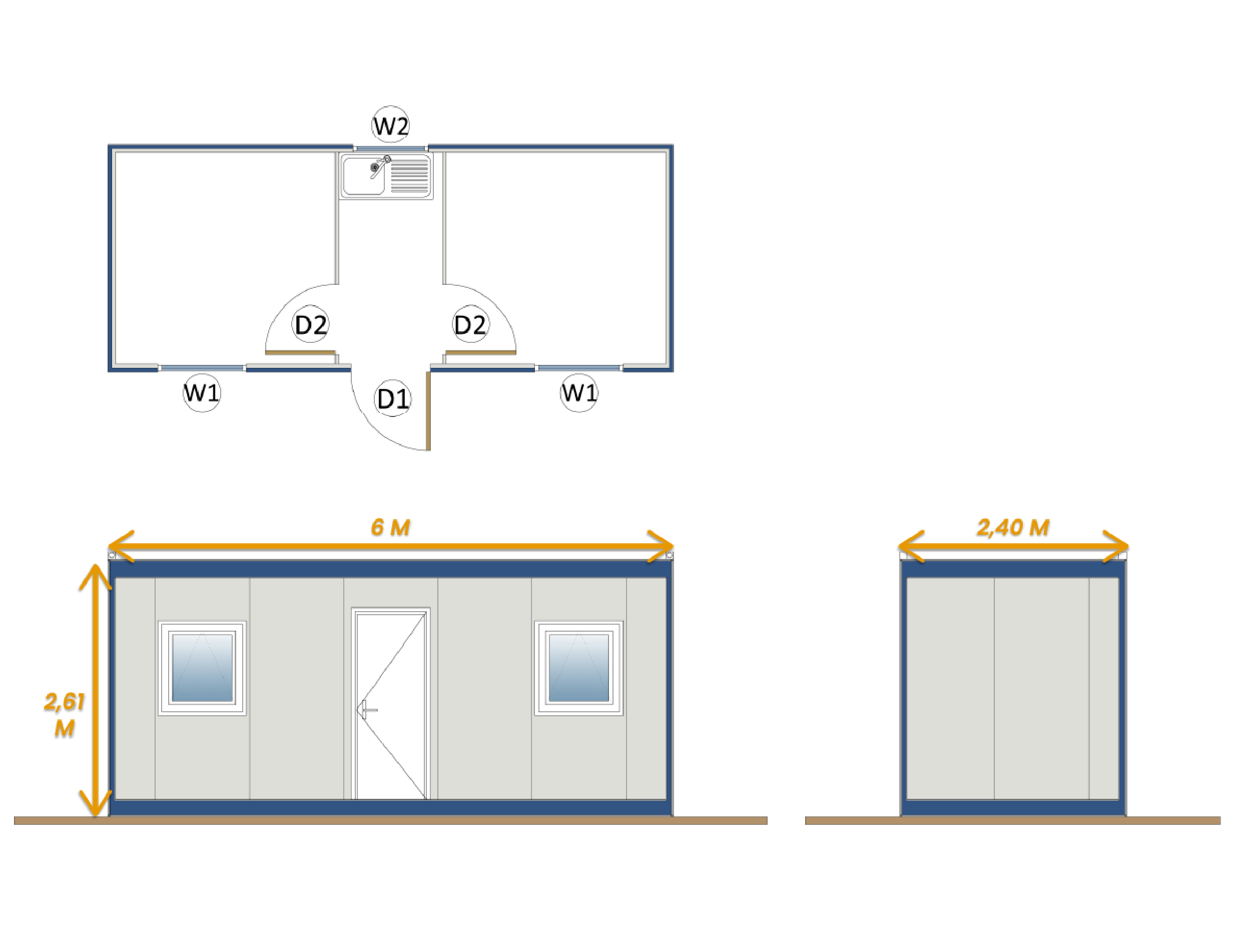 İki Ayrı Oda (2 Odalı Konteyner): Merkezi koridordan erişilen, her biri kendi bağımsız kapısına (D2) sahip iki adet izole oda bulunmaktadır. Bu odaların her biri, ön cephedeki geniş bir pencere (W1) ile aydınlanır ve havalandırılır. Bu düzen, bir odanın ofis, diğerinin yatakhane veya her ikisinin farklı ofisler olarak kullanılmasına olanak tanır.