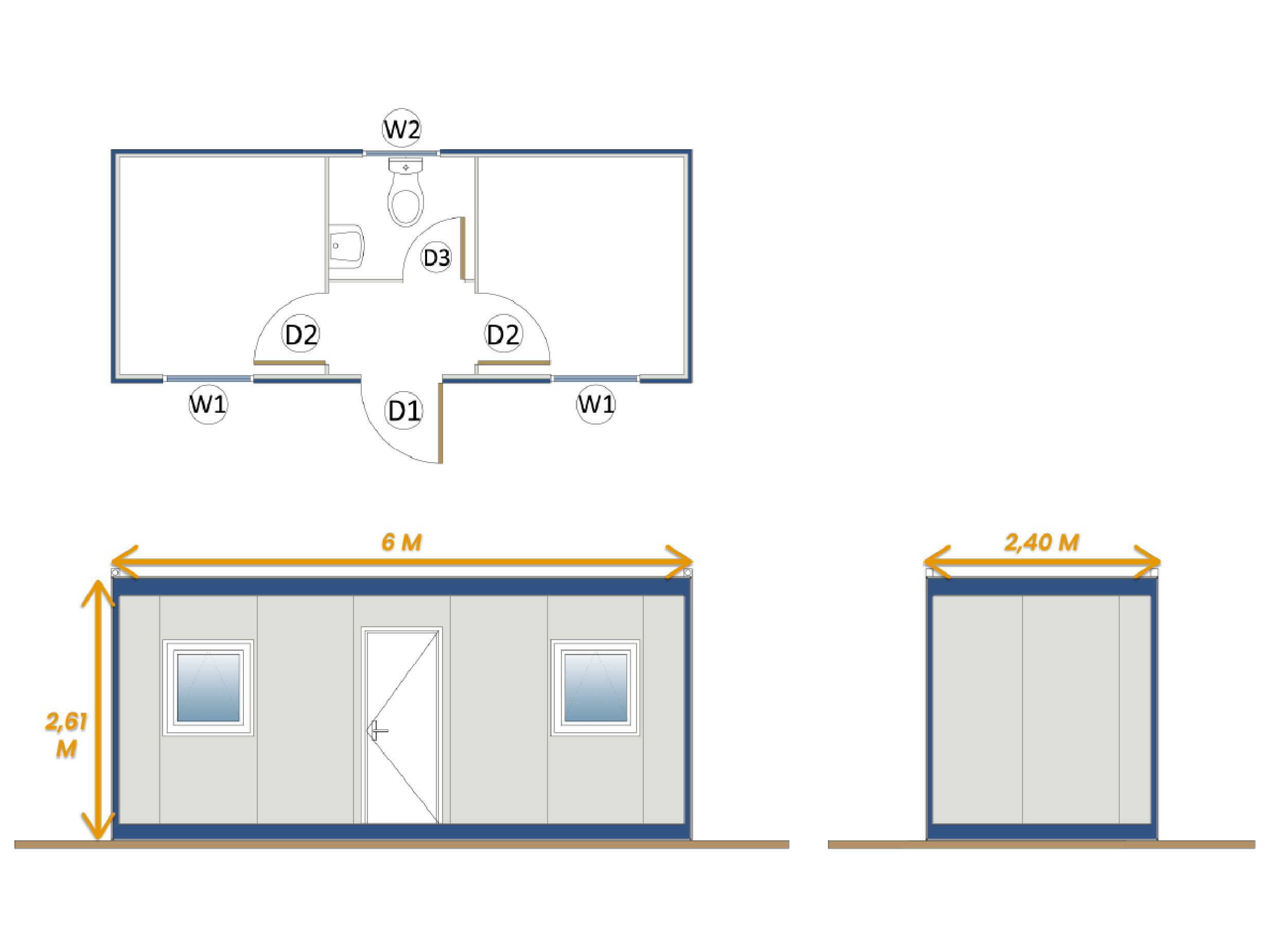2 Oda + 1 WC Kombinasyonu: Tek bir konteyner içerisinde iki ayrı çalışma birimi ve ortak bir ıslak hacim sunarak şantiye alanından tasarruf sağlar.