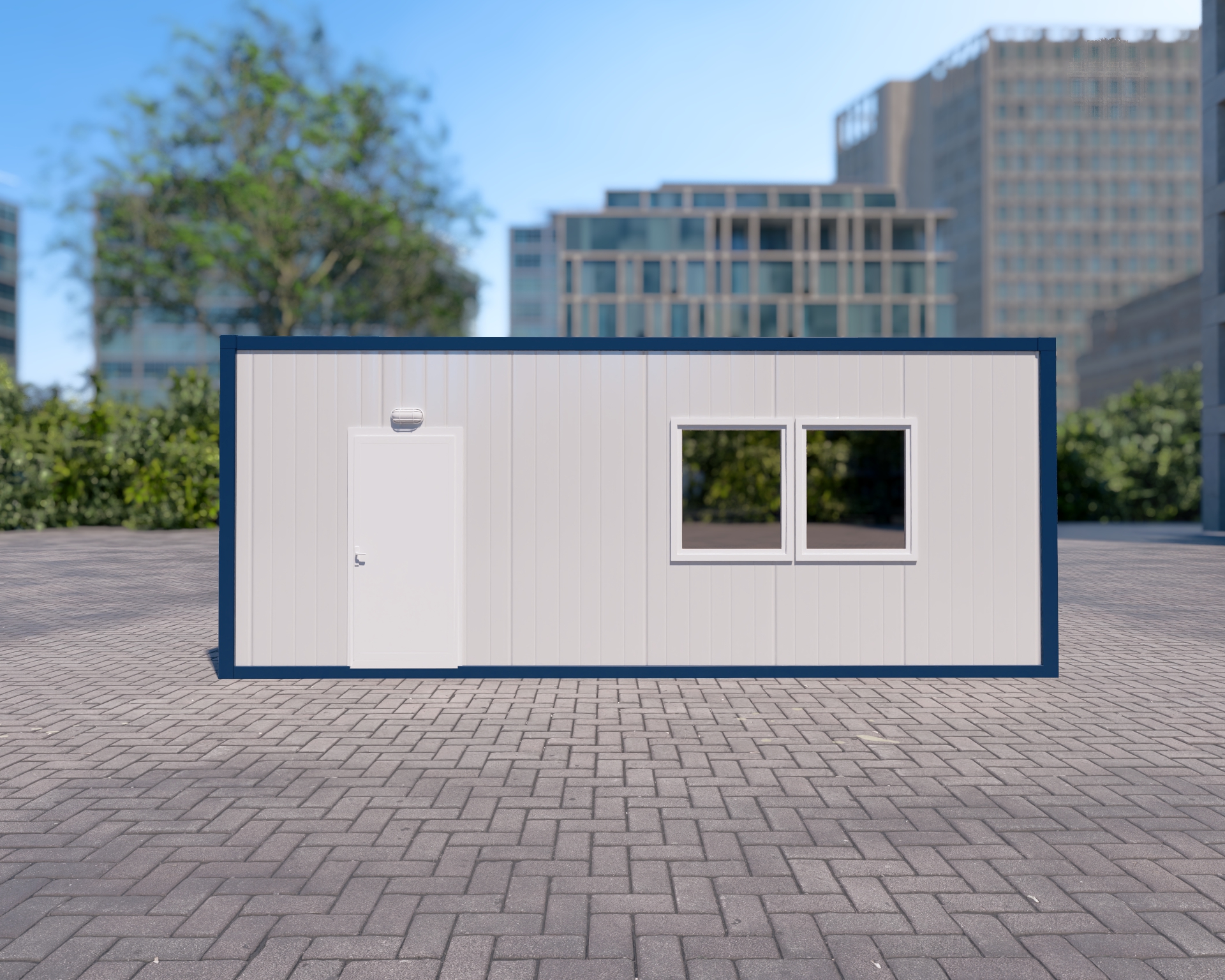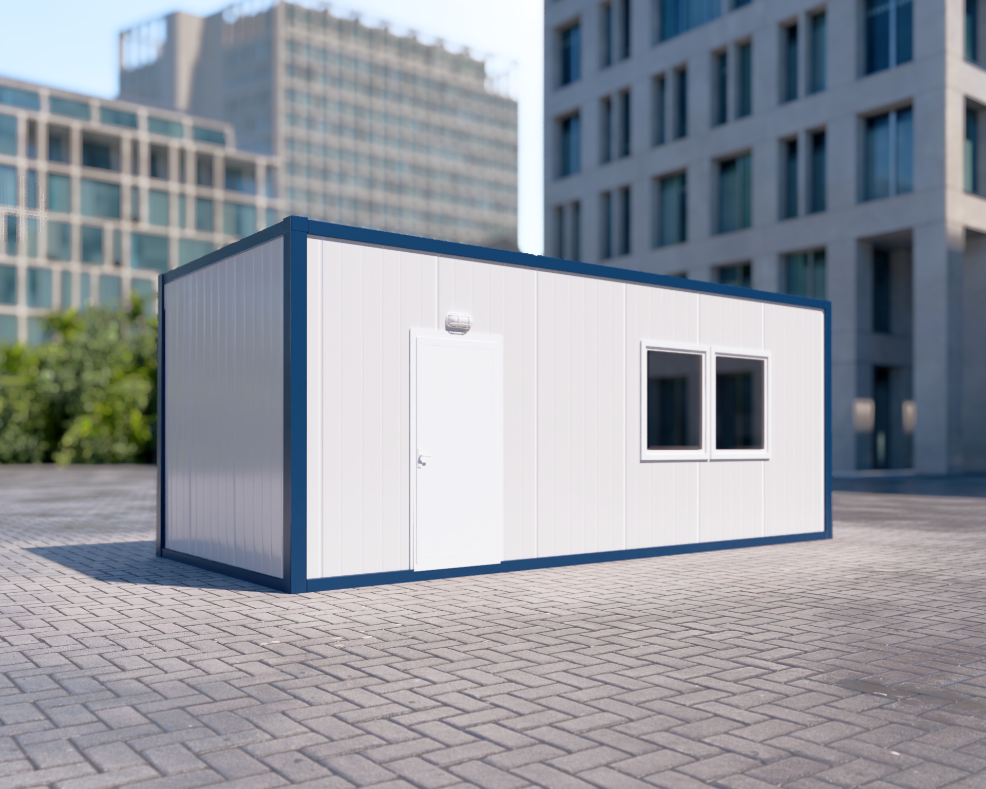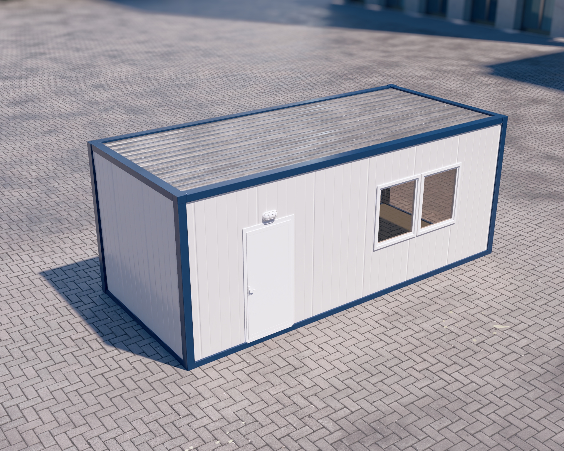 • Geniş ve Aydınlık Ana Ofis: D2 kapısı ile geçilen ana oda, konteynerin büyük bir kısmını kaplar. Ön cephedeki yan yana konumlandırılmış iki adet geniş pencere (W1), iç mekana bol miktarda doğal ışık girmesini sağlayarak ferah bir çalışma ortamı sunar (Görsel 1'de dış görünümü mevcuttur).