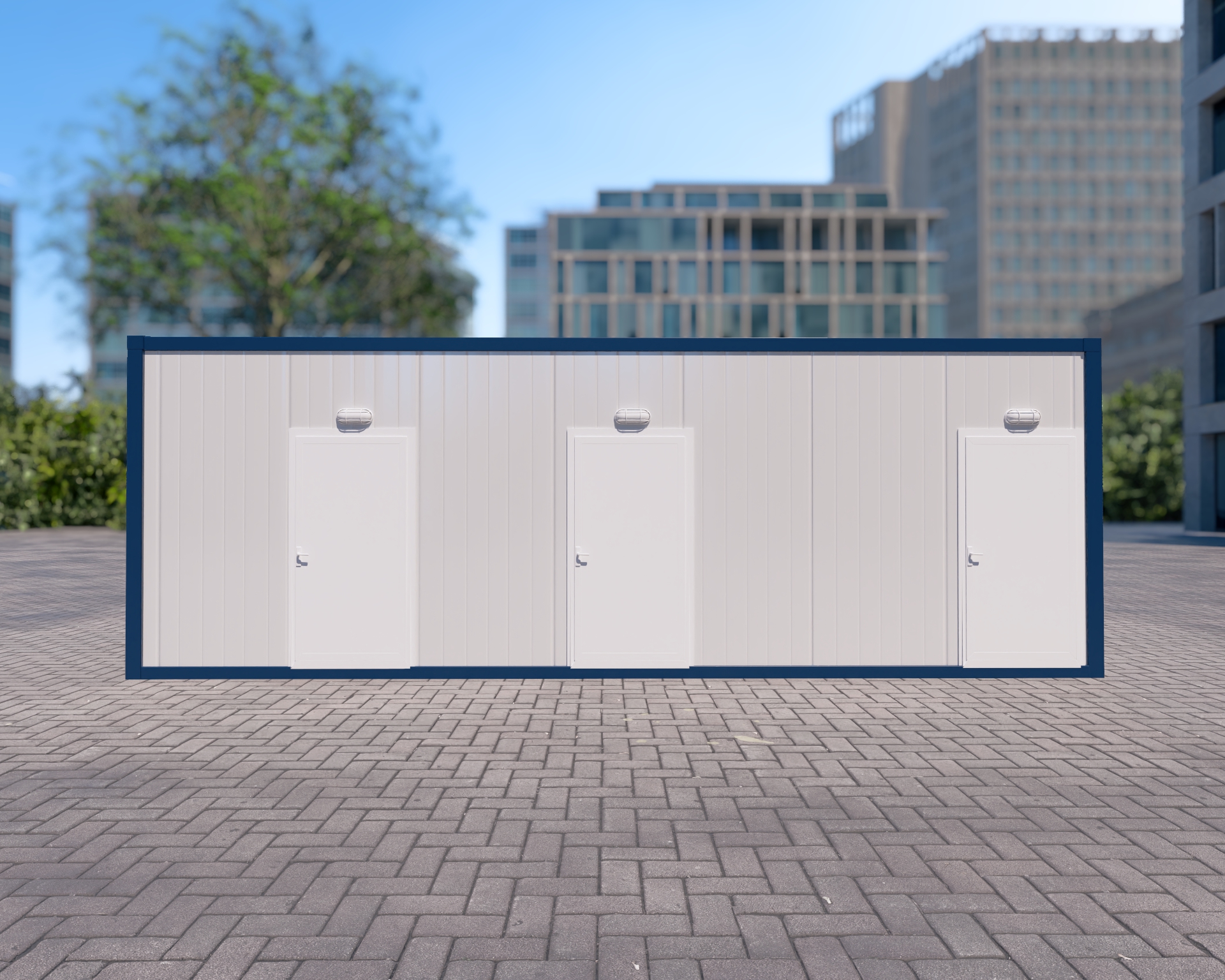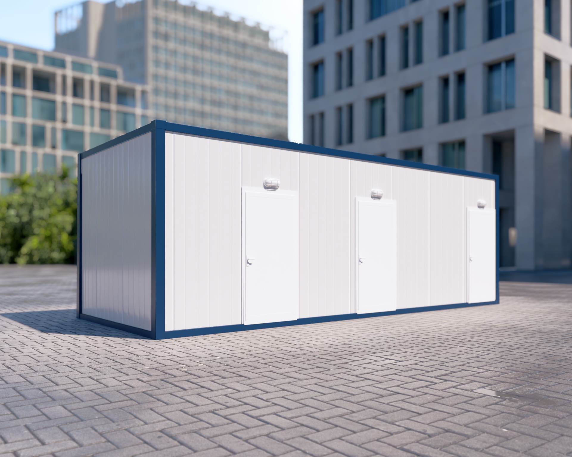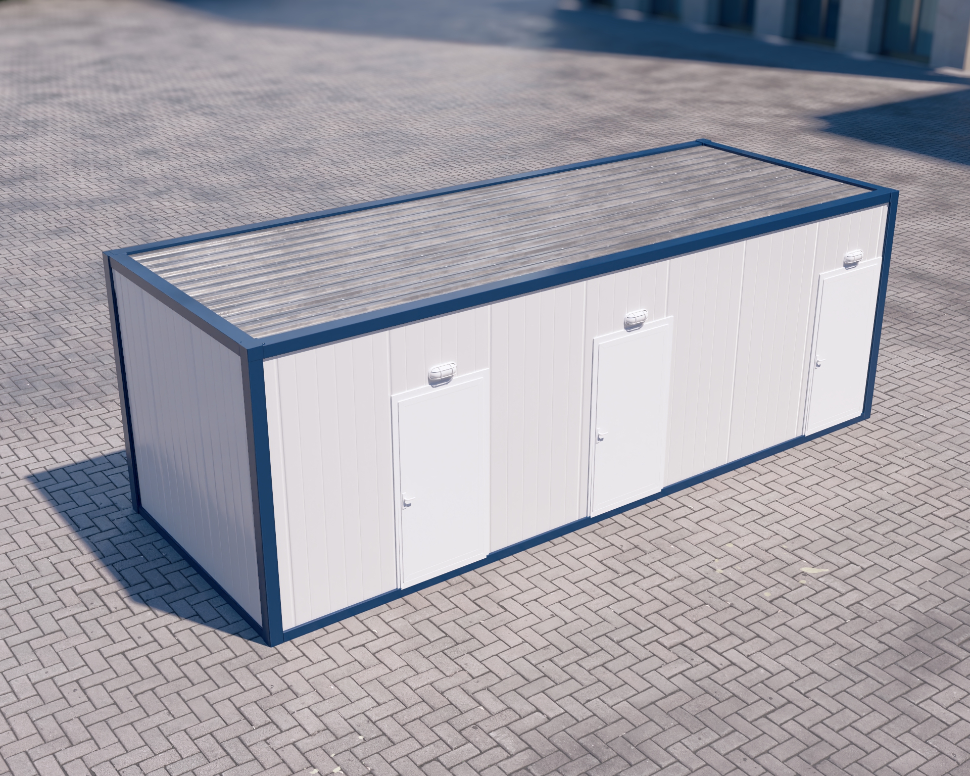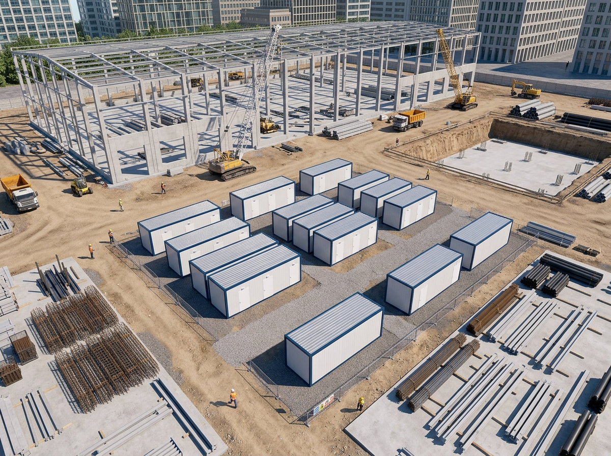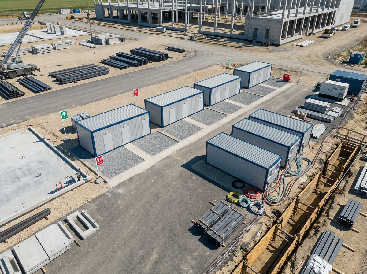 Estetik Dış Cephe: Yatay çizgili panel yapısı ve simetrik 3 kapılı tasarımıyla profesyonel ve düzenli bir şantiye görünümü destekler.